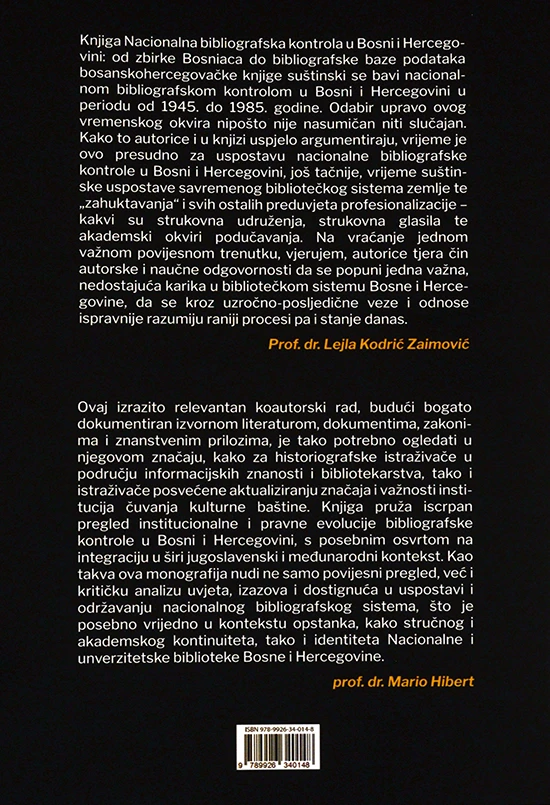 Publikacija sistematično razmatra historijski razvoj i savremene prakse nacionalne bibliografske kontrole, od formiranja zbirke Bosniaca do izgradnje bibliografskih baza podataka, te predstavlja vrijedan doprinos biblioteckoj teoriji i praksi u Bosni i Hercegovini.