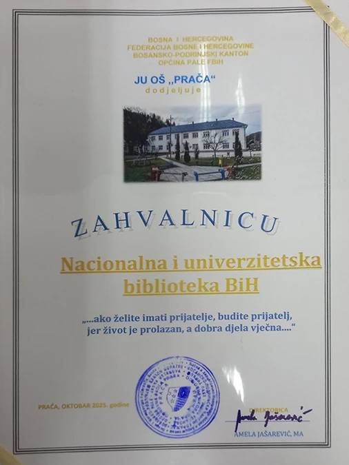Uposlenici Nacionalne i univerzitetske biblioteke Bosne i Hercegovine su dana, 01. 10. 2025. posjetili JU OŠ “Prača” u Prači sa ciljem jačanja saradnje i pružanja podrške obrazovnim ustanovama kroz donaciju knjiga. U okviru ove posjete, školskoj biblioteci je uručena vrijedna donacija knjiga, koja obuhvata naslove iz dječije književnosti, lektire, kao i priručnike namijenjene nastavnicima i pedagoškom osoblju. Donirani fond ima za cilj obogaćivanje bibliotečkih resursa i podsticanje čitalačkih navika među učenicima. Direktorica Amela Jašarević izrazila je veliko zadovoljstvo zbog proširenja fonda biblioteke doniranim knjigama, ističući da će to unaprijediti nastavne i vannastavne aktivnosti. Također je naglasila da biblioteka OŠ “Prača” ima javni karakter, jer je pored učenika, otvorena i za sve građane općine koji žele čitati i koristiti dostupnu literaturu.. Tokom posjete, direktorica škole, nastavnici i bibliotekarka razgovarali su s uposlenicima biblioteke o značaju razvijanja čitalačke pismenosti kod učenika, važnosti dostupne i kvalitetne literature, te o ulozi školske biblioteke kao centra znanja i kulture unutar lokalne zajednice.