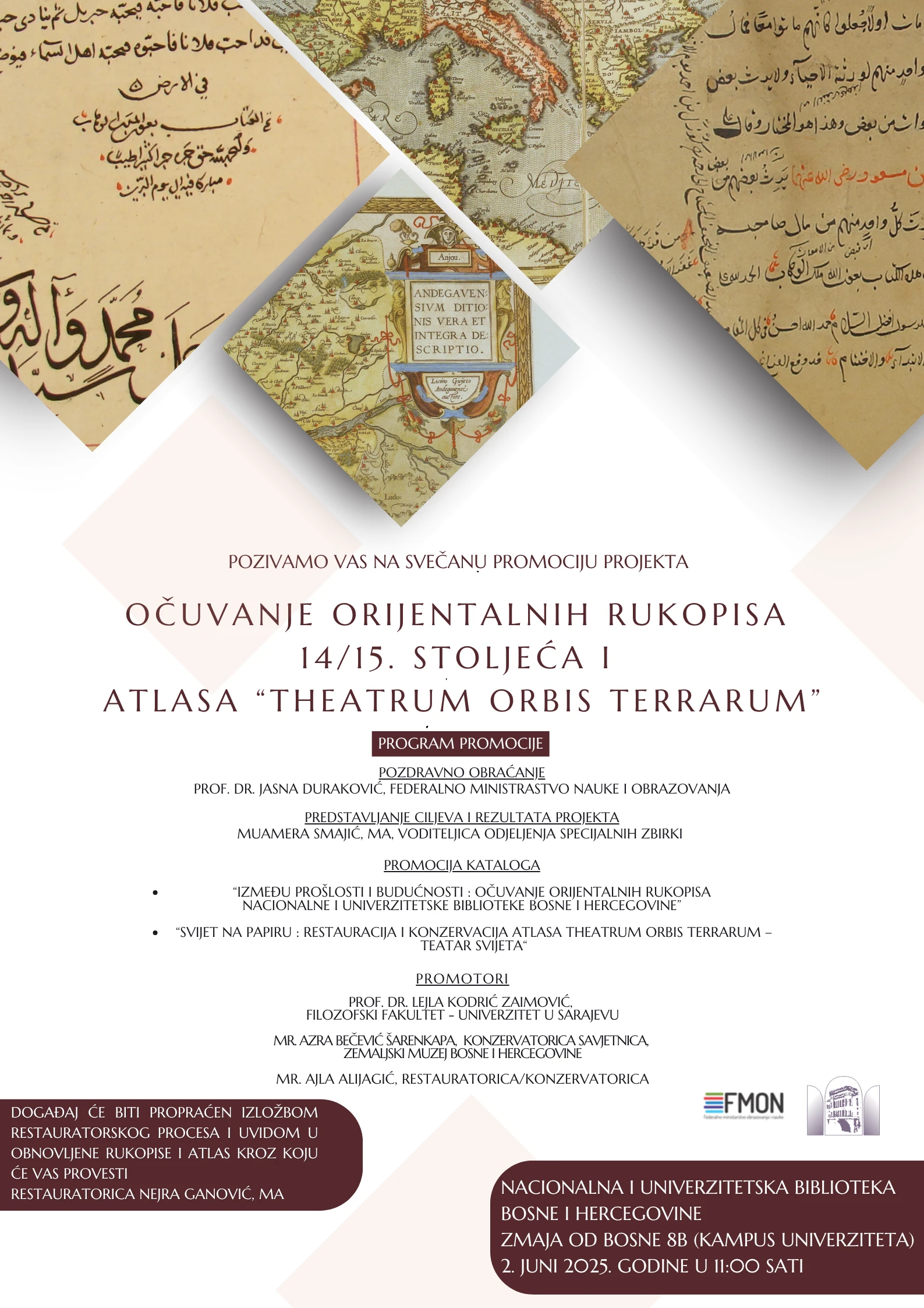 Nacionalna i univerzitetska biblioteka Bosne i Hercegovine (NUBBiH) srdačno vas poziva na svečanu promociju projekta „Očuvanje orijentalnih rukopisa 14. i 15. stoljeća i atlasa Theatrum Orbis Terrarum – Teatar svijeta (1592)”, koji se bavi zaštitom i prezentacijom vrijednih rukopisnih i kartografskih zbirki iz naše kulturno-historijske baštine. Projekt je realiziran uz podršku Federalnog ministarstva obrazovanja i nauke. Promocija će se održati 2. juna 2025. godine u 11 sati u prostorijama NUBBiH.