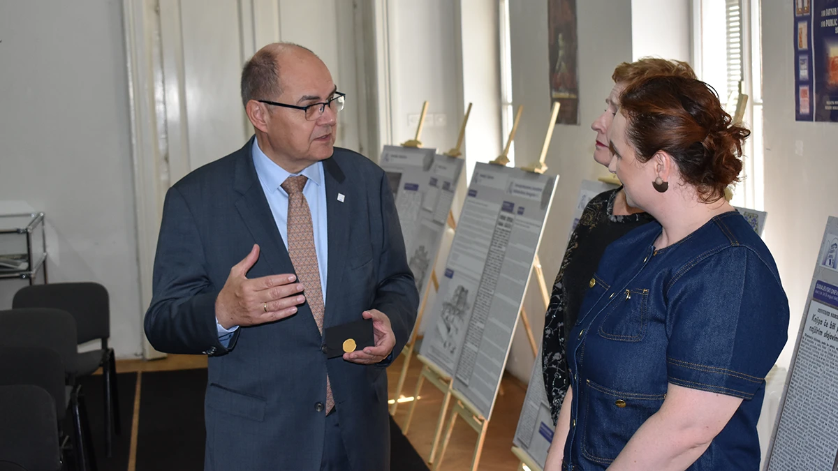 Nj.E. Christian Schmidt sa suprugom i saradnicima obišao je izložbu „U plamenu sjećanja“ koju je Nacionalna i univerzitetka biblioteka Bosne i Hercegovine pripremila zajedno sa Digitalnim arhivom „Infobiro“ Mediacentra Sarajevo u povodu obilježavanja 33. godišnjice spaljivanja ove institucije u Vijećnici.